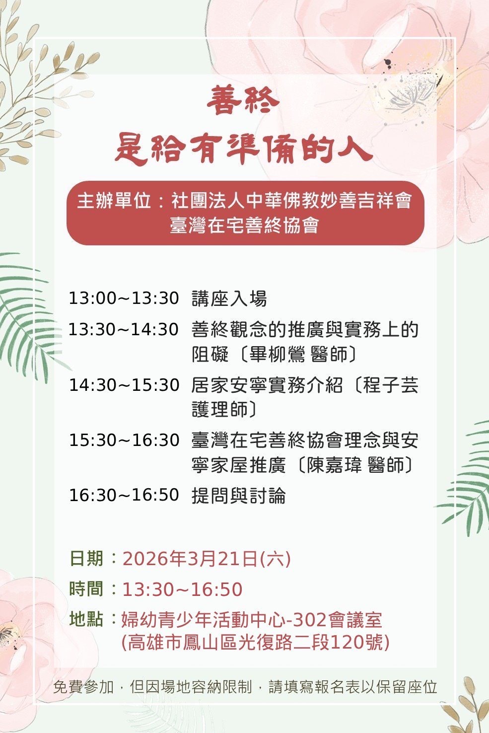 雖然網路上已有許多的影片和訪談紀錄(請瀏覽youtube搜尋台灣在宅善終協會頻道),但現場活動中都會有提問與交流時段,能夠聽到朋友的分享,觀念上的疑問、痛苦或圓滿的經驗、有為父母尋求善終資源方法的,也許已身陷照顧困境,也許只是來聽聽故事做概念準備,但相信多少都有收穫!