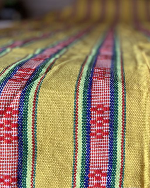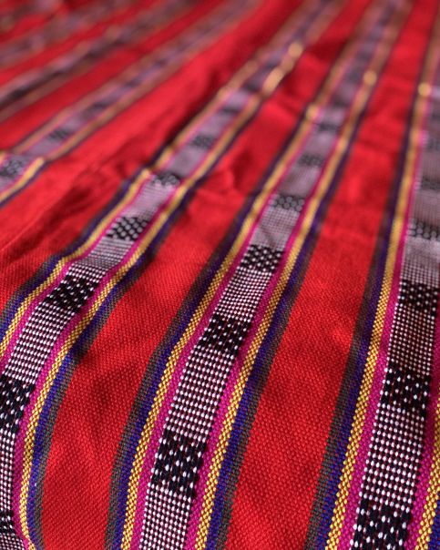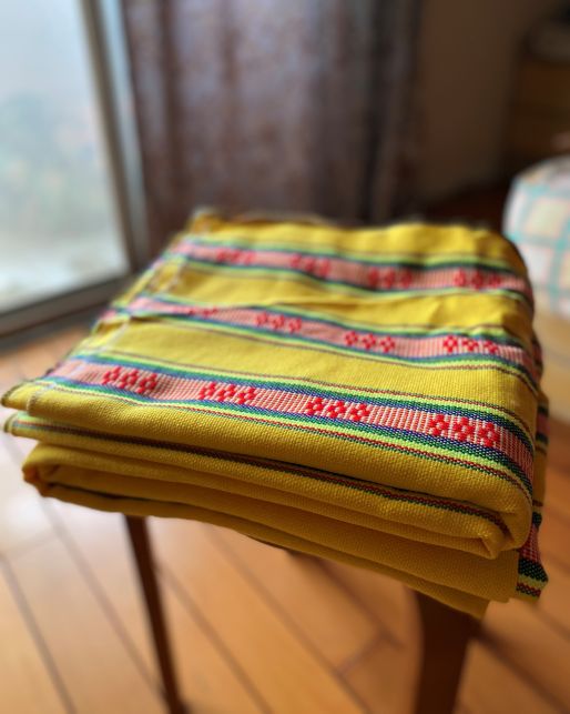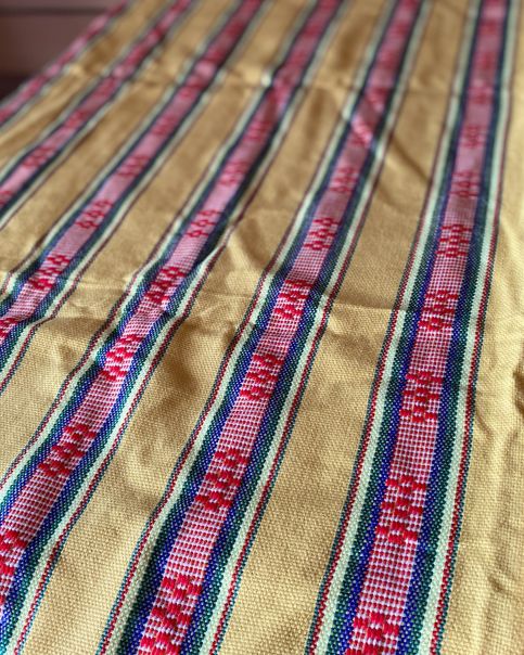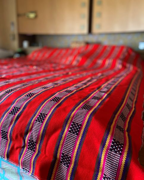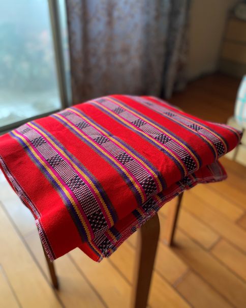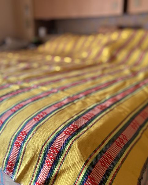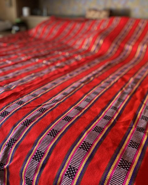 婚禮的祝福床單—台灣原住民的傳統紡織技術,純手工製作,由數幅約50公分寬的直條紡布再拚縫而成,可作為床罩,也可做為薄被單。