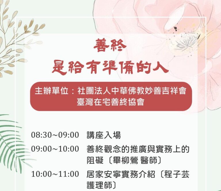 台北市松山區公益演講活動 主辦單位:社團法人中華佛教妙善吉祥會 與 台灣在宅善終協會 日期:2026 年 1 月 17 日 時間:8:30~12:30 – 8:30~9:00 入場報到 – 9:00~12:00 講座 – 12:00~12:30 Q&A 地點:台北市松山區健康路264號(捷運南京三民站一號出口) ▌報名連結