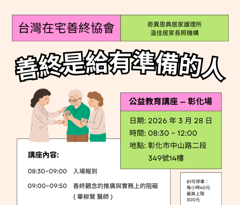 彰化市公益演講活動 主辦單位:台灣在宅善終協會 協辦:奇異恩典居家護理所、溫佳居家長照機構 日期:2026 年 3 月 28 日 時間:8:30~12:00 – 8:30~9:00 入場報到 – 9:00~11:40 講座 – 11:40~12:00 Q&A 地點:彰化市中山路二段349號14樓(大型會議室) ▌報名連結