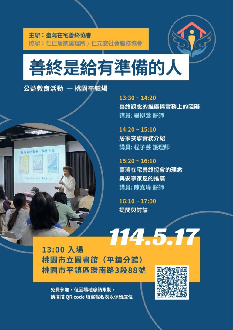 活動報告: 善終是給有準備的人 — 公益教育活動 (桃園平鎮場) 主辦單位:臺灣在宅善終協會 協辦單位:仁仁居家護理所、仁元安社會服務協會 時間:114年5月17日 13:00-17:00,演講13:30開始 地點:桃園市立圖書館(平鎮分館),桃園市平鎮區環南路三段88號