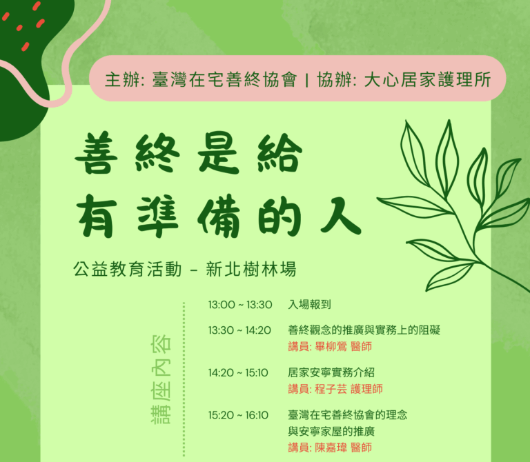 活動報告: 善終是給有準備的人 — 公益教育活動 (新北樹林場) 主辦單位:臺灣在宅善終協會 協辦單位:大心居家護理所 時間:114年7月19日(六) 13:00-17:00,演講13:30開始 地點:新北市樹林區大義路176號 (春城大砌) 一樓宴會廳