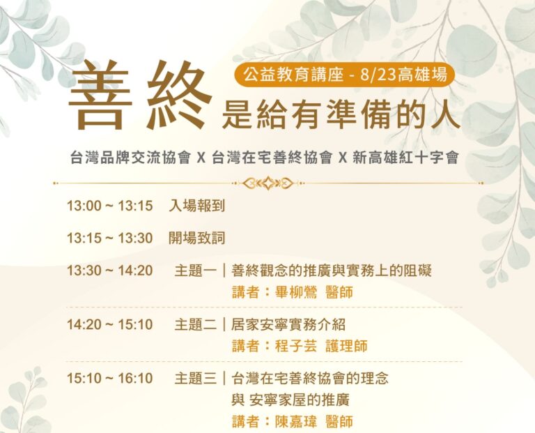 活動報告: 善終是給有準備的人 — 公益教育講座 (高雄場) 主辦單位:台灣品牌交流協會 協辦單位:台灣在宅善終協會、新高雄紅十字會 時間:114年8月23日(六) 13:00-17:00,演講13:30開始 地點:紅十字會人道教育暨長照服務發展中心 – 高雄市鳳山區維新路122號10樓